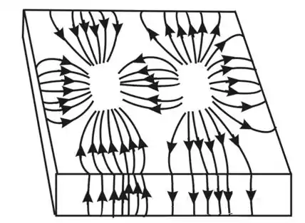 A densidade de corrente superficial J, em um guia de onda retangular, está representada na Figura 3.21. Observa-se na figura que J diverge na parede superior do guia, enquanto não diverge na parede lateral do guia.