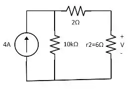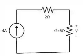 De acordo com a questão, a gente precisa descobrir a tensão V no circuito que tem uma fonte de corrente, para isso, a gente sabe que aplicando um divisor de corrente podemos encontrar a corrente Ir2 no resistor de 6Ω, que aqui chamo de r2, assim temos: