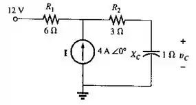 Desligando somente a fonte de 12V, podemos notar que nenhuma corrente passa por , graças ao circuito aberto no lugar da carga. Logo, a tensão AC de Thévenin é dada pela lei de Ohm: