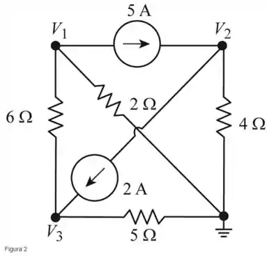 Vamos considerar o nó 2 na Figura acima, e encontraremos a tensão usando a análise nodal