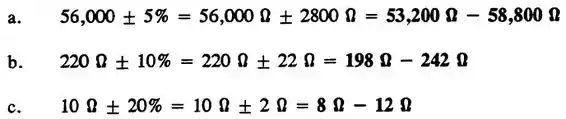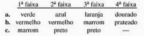 Determine os valores máximos e mínimos de resistências que os resistores com as faixas coloridas abaixo podem apresentar sem exceder a tolerância especificada pelo fabricante: