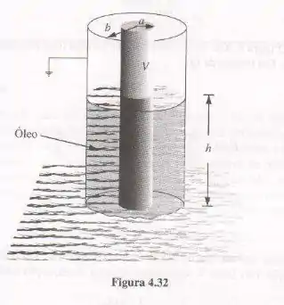 Dois tubos longos de metal, cilíndricos e coaxiais (raio interno a, raio externo b) estão colocados verticalmente em um tanque de óleo (suscetibilidade , densidade de massa ). O tubo interno é mantido a um potencial , enquanto o externo está aterrado (Figura 4.32). A que altura o óleo sobe no espaço entre os tubos?