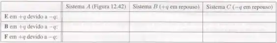 Então se liga só nessa questão do livro David J. Griffiths de Eletrodinâmica Duas cargas estão em trajetórias paralelas a uma distância , uma da outra, movendo-se à mesma velocidade em sentidos opostos. Estamos interessados na força sobre devido a no instante em que elas se cruzam. Preencha a tabela abaixo, fazendo durante o processo, todas as verificações de coerência que puder pensar.