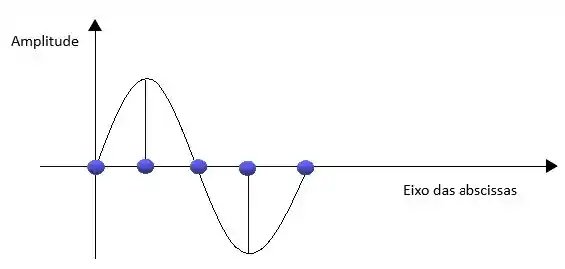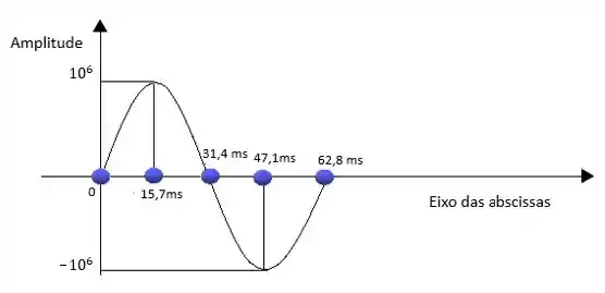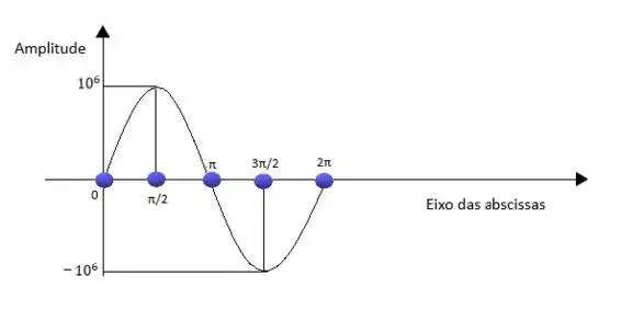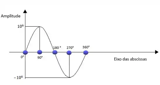 Observamos que a senóide mostrada acima é bem genérica, porque em nosso exercício vamos ter que completar as bolinhas azuis com ângulos em radiano, grau e tempo.