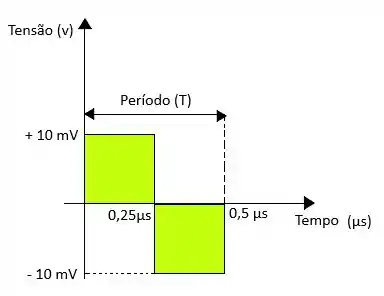 Faça um esboço de uma onda quadrada periódica como a que aparece na figura 13.84 com uma frequência de 20.000 Hz e o valor de pico 10 mV.