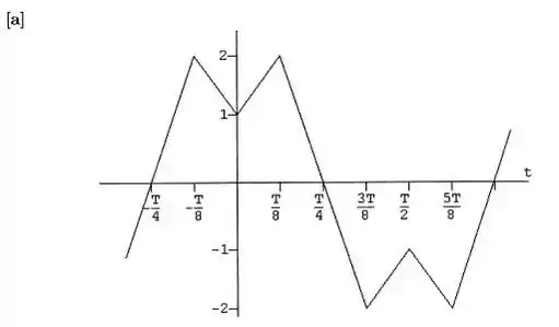 A função periódica da Figura P16.16 é par e tem simetria de meia-onda e de quarto de onda.a) Faça o gráfico de um ciclo completo da função no intervalo .b) Calcule os coeficientes de Fourier c) Escreva os primeiros três termos não-nulos da série de Fourier de .d) Use os primeiros três termos não-nulos para estimar .