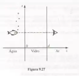 A luz de um aquário (Fig. 9.27) vai da água (n=34) através de um plano de vidro (n=23) no ar (n = 1). Assumindo que seja uma onda plana monocromática e que atinja o vidro com incidência normal, encontre os coeficientes de transmissão mínimo e máximo (Eq. 9.199). Você pode ver o peixe claramente.Com que nitidez ele pode ver você?