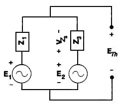 Desligando as fonte e , obtemos um curto circuito em seus lugares, de modo que e ficam em paralelo, e esta associação fica em série com . Logo, é dado por: