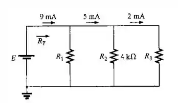 Nosso primeiro passo é saber que a corrente que entra num nó tem que ser igual à corrente que sai dele, porque nada se perde lá no meio. Então, sabendo disso, descobrimos qual a corrente que passa em R1 e R2 (a de R3 ele já diz que é 2 mA).
