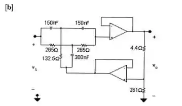 a) Usando o circuito mostrado na Figura 15.29, projete um filtro rejeita-faixa de banda estreita que tenha uma frequência central de e um fator de qualidade de 15. Use no projeto .