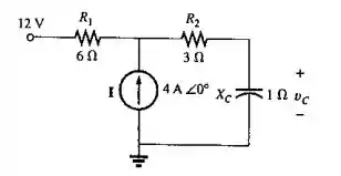 Em nossa primeira análise, vamos desligar a fonte . Como teremos apenas a ação de uma fonte de tensão DC no circuito, o capacitor se comporta como um circuito aberto e a tensão DC é igual a . Moleza, né?