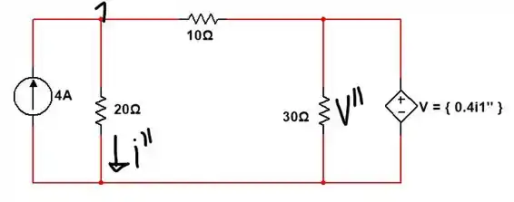 Utilizando a análise nodal, vamos aplicar a LKC aos nó 1 e ao nó da tensão V’’: