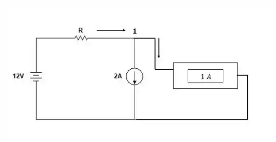 Agora, basta aplicarmos a LKT ao laço formado pela fonte de 12 V, R e o ramo do amperímetro:
