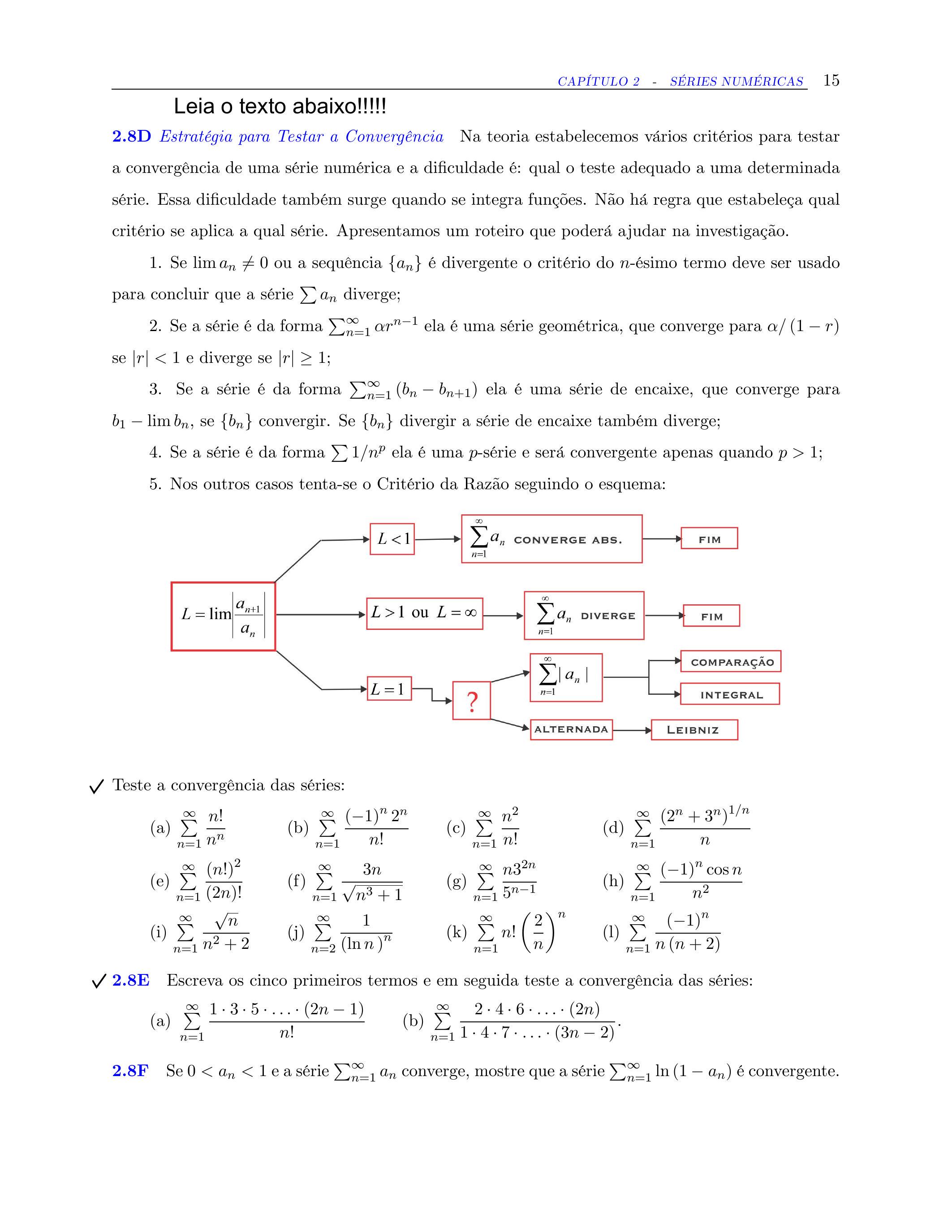 e combinações delas. Para cada item, teremos de decidir se é verdadeiro ou falso e, em caso de falso, dar um contra-exemplo; em caso de verdadeiro, apresentar uma justificativa com teste apropriado (comparação, limite, critério de Leibniz, etc.).