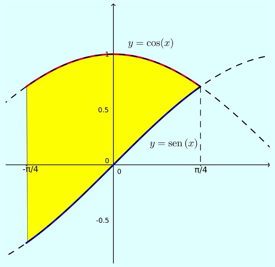 A=integral-pi / 4^pi / 4(cos x-sen x) d x=raiz2 ua e