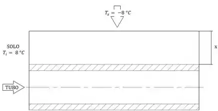 Um terreno em determinado local está coberto com uma camada de neve a durante o período contínuo de , e as propriedades médias do solo local são e . Pressupondo uma temperatura inicial uniforme de para o solo, determine a profundidade mínima em que os dutos de água devem ser enterrados para evitar o congelamento da água.