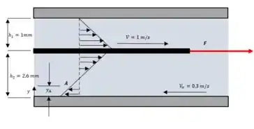 E sua distância da placa inferior é determinada por considerações geométricas (a semelhança dos dois triângulos na camada inferior de óleo) como sendo: