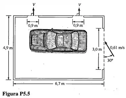 Ar escoa com velocidade de na porta da garagem esboçada na fig. (a altura da porta é igual a ). Determine a velocidade média dos escoamentos nas duas janelas indicadas na figura, , sabendo que as alturas das janelas são iguais a .