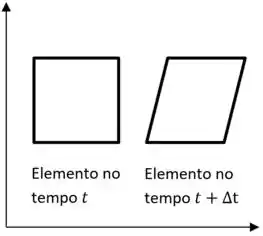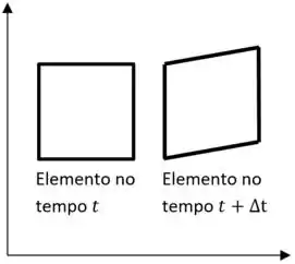 na figura abaixo um elemento de fluido é considerando em um tempo . Depois de um tempo taxa de mudança de velocidade na direção com respeito a () se torna muito maior que a mudança na velocidade na direção com respeito a ()