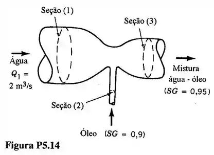 A fig. mostra um ejetor líquido-líquido que arrasta um óleo que arrasta um óleo que apresenta densidade igual a . A vazão de água é e a mistura água-óleo apresenta densidade igual a . Calcule a vazão de óleo arrastada nesse ejetor.