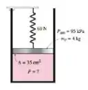 Um gás está contido em um dispositivo vertical pistão-cilindro e sem atrito. O pistão tem massa de 4 kg e uma seção transversal de . Urna mala comprimida acima do pistão exerce uma força de sobre ele. Se a pressão atmosférica for de , determine a pressão dentro do cilindro.
