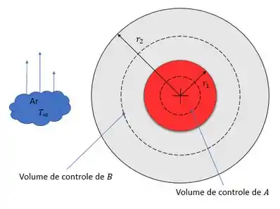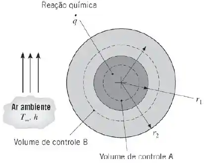 Em uma partícula esférica de raio há geração térmica uniforme a uma taxa . A partícula é encapsulada por uma casca esférica com raio externo , que é resfriada pelo ar ambiente. As condutividades térmicas da partícula e da casca são e , respectivamente, sendo = .