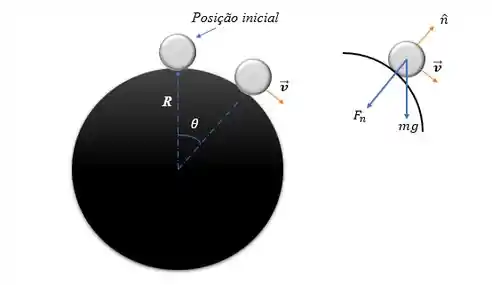 Uma pequena bola de aço de raio , colocada no topo de uma esfera muito maior, de raio , começa a rolar sob a influência da gravidade. As resistências de rolamento e do ar são desprezíveis. Quando a velocidade da bola aumenta, ela deixa a superfície da esfera e torna-se um projétil. Determine o local em que a bola perde o contato com a esfera.