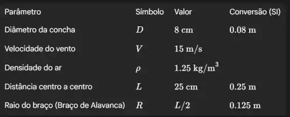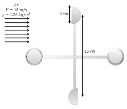 Este é um problema de Dinâmica de Fluidos (Arrasto) que trata do torque máximo exercido por um anemômetro de conchas (turbina eólica) que está fixo. O torque é gerado pela diferença nas forças de arrasto entre as conchas que enfrentam o vento e as conchas que se afastam dele.