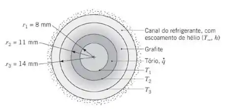 Um reator nuclear de alta temperatura com resfriamento a gás é formado por uma parede cilíndrica composta, na qual um elemento combustível de tório (k ≈ 57 W/(m · K)) encontra-se envolto em grafite (k ≈ 3 W/(m · K)) e hélio gasoso escoa através de um canal anular de resfriamento. Considere condições nas quais a temperatura do hélio é de = 600 K e o coeficiente convectivo na superfície externa do grafite é de h = 2000 W/(m² · K).