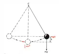 Um pêndulo de de comprimento, com uma bolinha de , é largado do repouso quando forma um ângulo de com a vertical. Na parte mais baixa da oscilação, a rapidez da bolinha é .