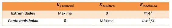 Extremidades: Nesse ponto a gente sabe que a velocidade dele é zero, certo? Então nesse ponto toda a energia mecânica dele vai ser a energia potencial gravitacional, pois a energia cinética é nula!