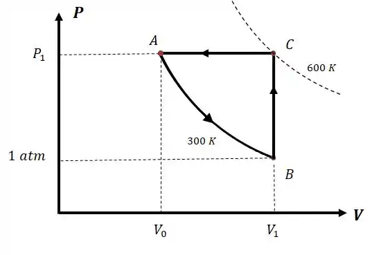 mol de um gás ideal, com , descreve o ciclo representado na figura no plano . (a) Represente o ciclo no plano , indicando (em atm) e (em ) associados aos pontos , e . (b) Calcule , e para os processos , , e o ciclo.