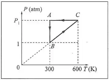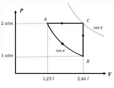 No processo a temperatura aumenta até ao longo de uma reta (isso indica um processo isovolumétrico), e a pressão volta ao valor .