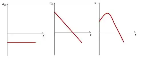 Já a velocidade começa em, ou seja, no início é positiva, mas depois, como a aceleração é negativa, a velocidade vai diminuindo, então o gráfico dela vai ser uma reta decrescente.