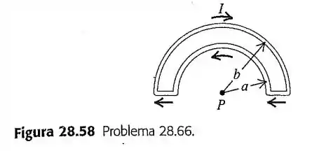 66- Os fios que formam as semicircunferências indicadas na figura possuem raios e . Determine o módulo, a direção e o sentido do campo magnético resultante produzido pelas correntes dos fios no ponto .