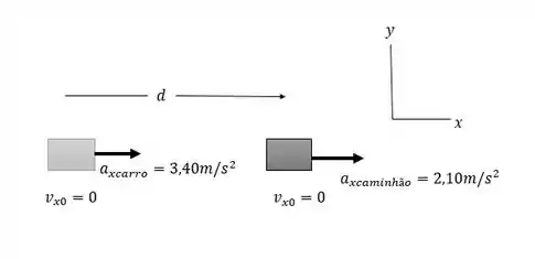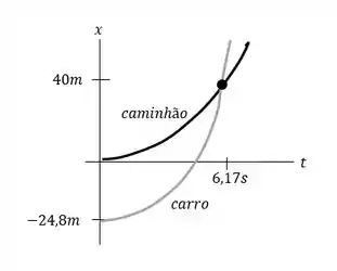 Seja o tempo leva o auto para pegar o caminhão. Assim, no tempo , o caminhão passou por um deslocamento: