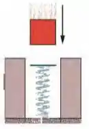 Um bloco de é deixado cair em uma mola vertical, inicialmente relaxada, cuja constante elástica é (Fig. 7-44). O bloco fica acoplado à mola, comprimindo-a em até parar momentaneamente. Nessa compressão, que trabalho é realizado sobre o bloco (a) pela força gravitacional e (b) pela força elástica? (c) Qual é a velocidade do bloco imediatamente antes de se chocar com a mola? (d) Se a velocidade no momento do impacto é duplicada, qual é a compressão máxima da mola?