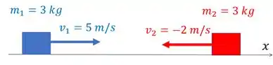 Temos dois blocos viajando com velocidades contrárias. Primeiro, vamos definir como o sentido positivo do eixo para a direita.