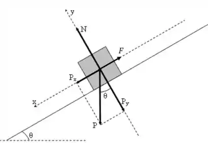 Perfeito! Mas ainda precisamos melhorar isso aí para encontrar um valor para a força F. Nossa saída vai ser utilizar as relações trigonométricas do triângulo retângulo; é só olhar para a figura ali em cima e reparar no triângulo pequeno formado nas forças lá no bloco. Isso vai nos permitir decompor o peso da seguinte forma: