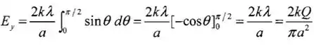 O campo elétrico pela direção da metade da esquerda e da metade da direita do semicírculo se cancelam. Então só calcularemos o eixo na direção . A carga por unidade de comprimento do semicírculo é: