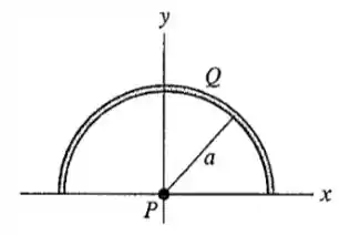 Uma carga positiva é distribuída uniformemente ao longo de uma semicircuferência de raio (Figura 21.49). Obtenha o campo elétrico (Módulo, direção e sentido) no centro de curvatura P.