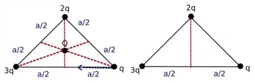 Para começar, vamos tratar 3 retas em nosso triângulo onde passam pelo ponto centrado o qual se encontra a carga, A altura h do triângulo é dada por , caso você não consiga perceber isso, mostrarei de um jeito bem fácil. Outro ponto que devemos descobrir é o valor da reta “d” que é um valor arbitrário que depende de “a”. Após isso nós devemos apenas decompor os vetores e escrever as forças eletrostáticas em cada sentido dos versores î e ĵ.