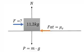 Pra isso, ele nos deu a massa da caixa , a velocidade com que ela se move e o coeficiente de atrito cinético . Além disso, sabemos que velocidade constante implica na aceleração e que a força de atrito é direcionada para o lado oposto ao movimento da caixa. Então, chamando a força do trabalhador de , temos: