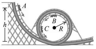 Um carro em um parque de diversões se desloca sem atrito ao longo do trilho indicado na Figura 7.32. Ele parte do repouso no ponto A situado a uma altura acima da base do círculo. Considere o carro como uma partícula. a) Qual é o menor valor de (em função de ) para que o carro atinja o topo do círculo (ponto B) sem cair? b) Se e , calcule a velocidade, o componente radial da aceleração e o componente tangencial da aceleração dos passageiros quando o carro está no ponto C, que está na extremidade de um diâmetro horizontal. Use um diagrama aproximadamente em escala para mostrar esses componentes da aceleração.