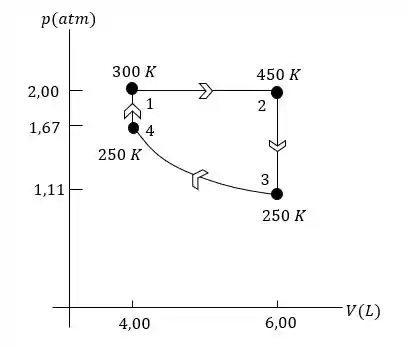 a)Mostre esses quatro processos em um diagrama , fornecendo os valores números de e em cada um dos quatro estados. b) Calcule e em cada um dos quatros processos. c) Ache o trabalho total realizado pelo oxigênio. d) Qual é a eficiência desse dispositivo como máquina térmica? Como se compara essa eficiência com a eficiência de um ciclo de Carnot entre as mesmas temperaturas extremas de 250 K e 450 K?