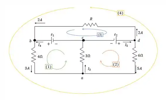 Aqui, vamos aplicar a regra de junção nos pontos a , b , c e d para calcular as correntes desconhecidas. Em seguida, aplicaremos a regra do loop para três voltas para calcular ε 1 , ε 2 e R .