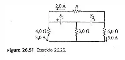 No circuito indicado na Figura 26.51, calcule (a) a corrente no resistor de 3,0   Ω ; (b) a fem ε 1 e a fem ε 2 ; (c) a resistência R . Observe que foram fornecidas três correntes.