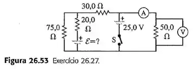 No circuito indicado na Figura 26.53, as baterias possuem resistencia interna desprezivel e ambos os instrumentos são ideias. Com a chave aberta, o voltimetro registra 15,0 V. (a) Ache a fem da bateria. (b) Qual será a leitura do amperimetro quando a chave for fechada?