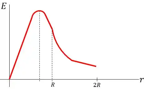 Agora, para a região , consideramos uma superfície gaussiana com esse raio. Usando a lei de Gauss para ela, temos: