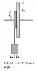 Dois discos metálicos, um com raio e massa e o outro com raio e massa , são soldados juntos e montados em um eixo sem atrito passando pelo centro comum (Figura 9.37). a) Qual é o momento de inércia dos dois discos? b) Um fio fino é enrolado na periferia do disco menor, e um bloco de é suspenso pela extremidade livre do fio. Se o bloco é libertado do repouso a uma distância de acima do solo, qual é sua velocidade no momento em que atinge o solo? c) Repita o cálculo do item (b), desta vez com o fio enrolado na borda do disco maior. Em qual caso a velocidade escalar final do bloco é maior? Explique por quê.